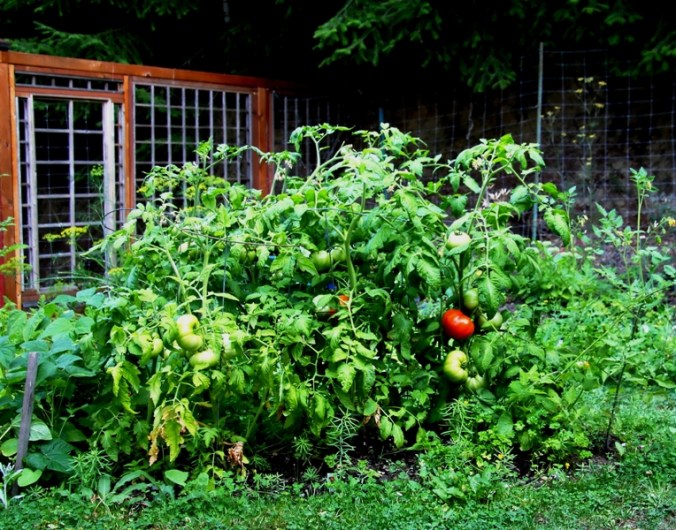 Our recent warm spell has started these tomatoes ripening on the vine. They are only two weeks behind those grown in local organic greenhouses. We have those huge fir trees all around us and this is the most sun I could find in the yard within the deer fence. So I decided to give it a try. I’m impressed because the sun doesn’t reach the plot until 10:00 am and it is in the shade again by 4:00 pm.