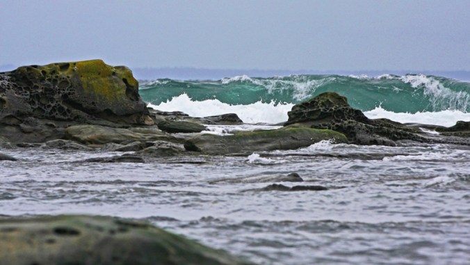 There was another wind warning yesterday. It didn’t amount to much. Sometimes this happens because Mayne Island is often on the edge of a storm as it sits where the swirly marks on the weather report change directions. But after the last storm we need some more butane for the little heater and cooking element. It is always best to be prepared. We are also low on groceries so I venture out – with my camera too of course.  When I am done my chores I  go to our favourite beach and see what I can see even though there is a light rain, a good wind and visibility ceiling is low.  Yike!