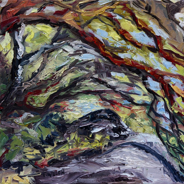 The reference for this paintings comes from a powerful experience when I found an intriguing visual path along the top of a cliff. I had to lay on my side and schooch out onto a rock ledge to capture the reference image. The amazing thing was that the scene had always been there but I hadn’t noticed it before this particular walk when its beauty was revealed in the angle of the evening light.