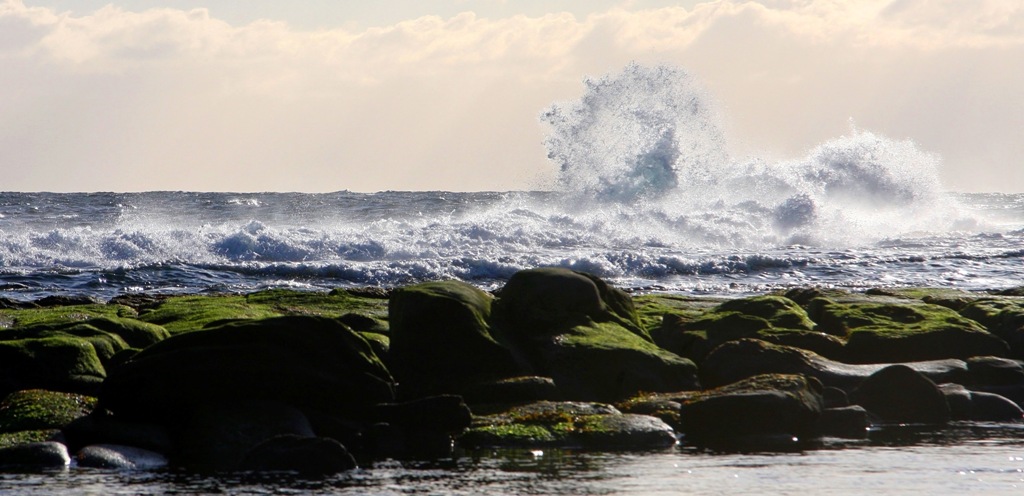 Well, it is Saint Patrick’s Day. In honour of the day of green, a long ago almost forgotten wedding day and the blessing of being alive, here is a splash of sea spray over the green seaweed on the rocks at Reef Bay.