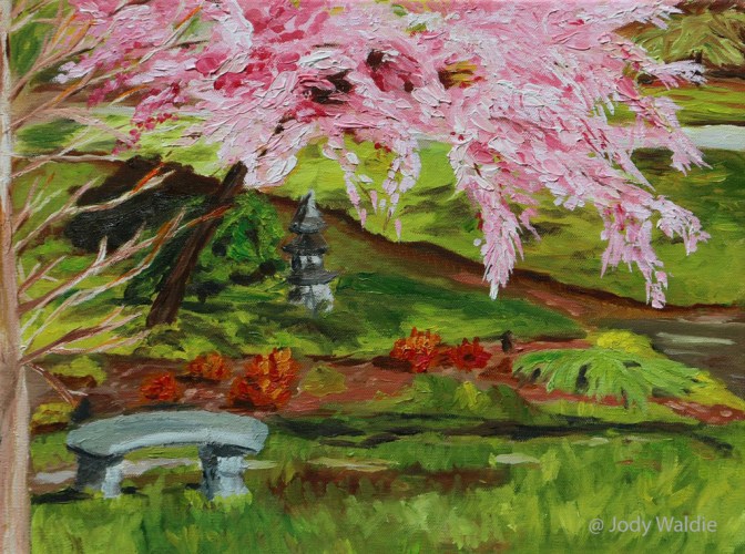 Plum Blossoms (Japanese Garden) 14 x 11 walnut oil on canvas panel – NFS