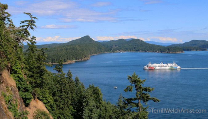 The Queen of Nanaimo ferry is finding its way from Saltspring Island and Galiano Island gives a looming welcome on the right.