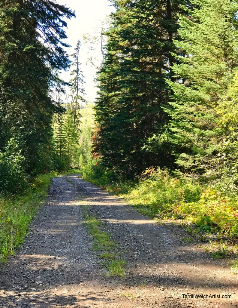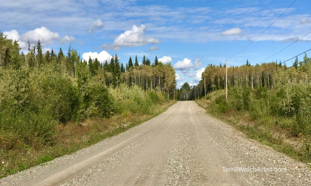 The last half of the 40 km from Vanderhoof is a well cared for gravel road that can get mucky after a rain (Red Rosie can tell that story this morning) as it has that stuff on it to keep the dust down. There are farms and rural homes on the way out. But, once we are this far, they are set way back off the main road. I always think when I make it to here – not long now!