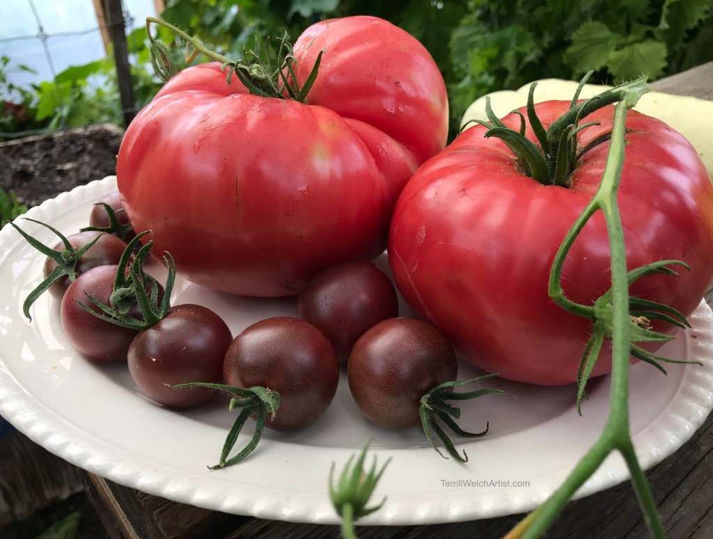 These beauties are the large brandy wine and small chocolate tomatoes on a platter ready to go to the house for supper.