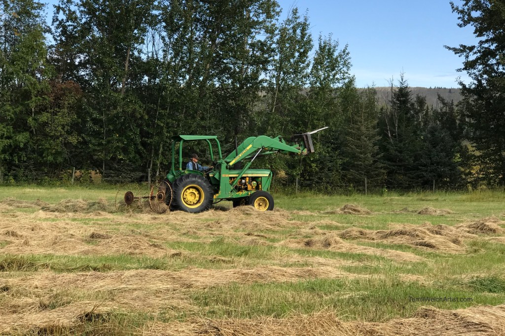 Dad turning the last of the hay in the field closet to the river. There was still a small amount right by the house to finish up when we left. But he has to wait for another chance to get it, if he gets it. The fall rains, heavy dew and fog sometimes have a different idea.