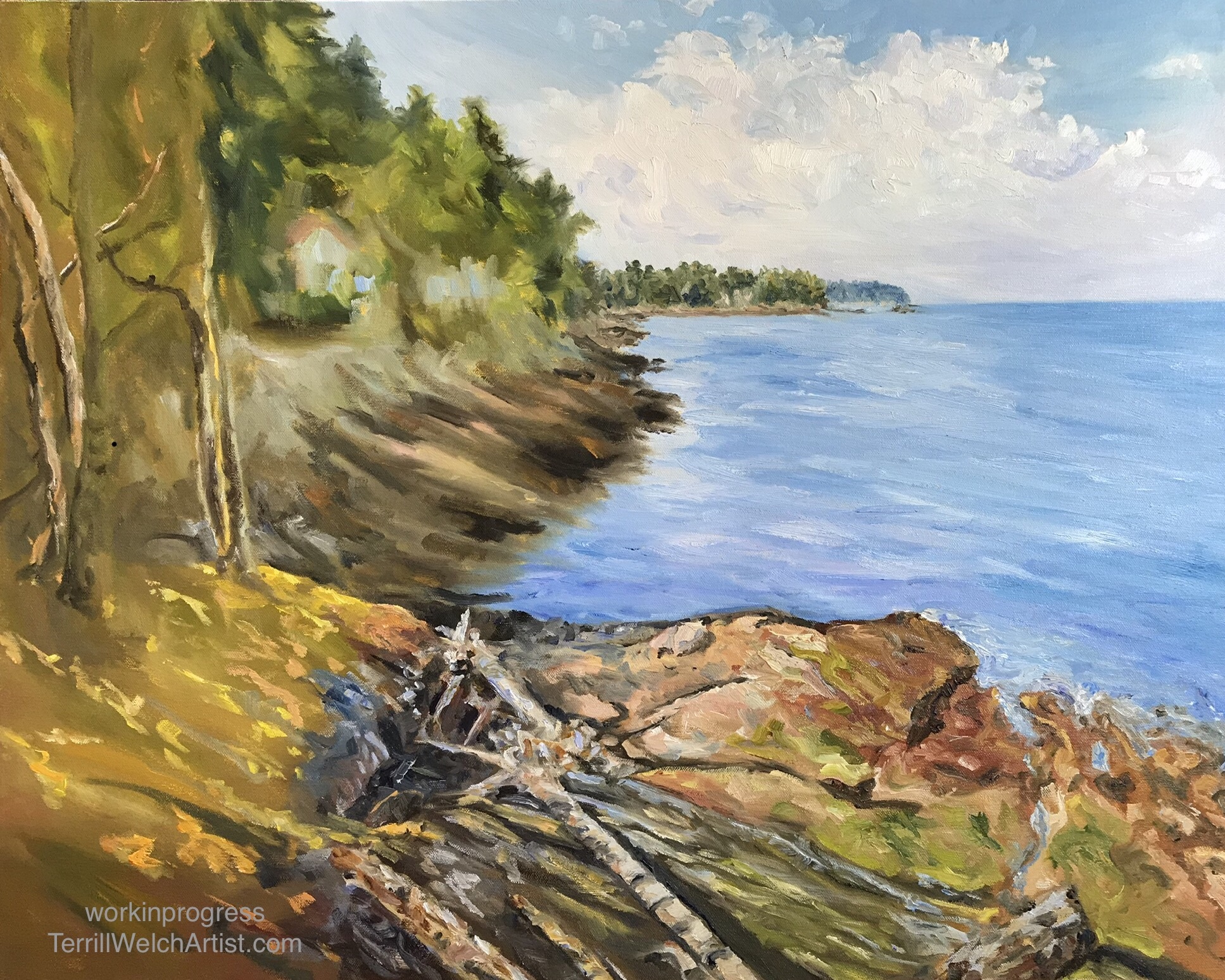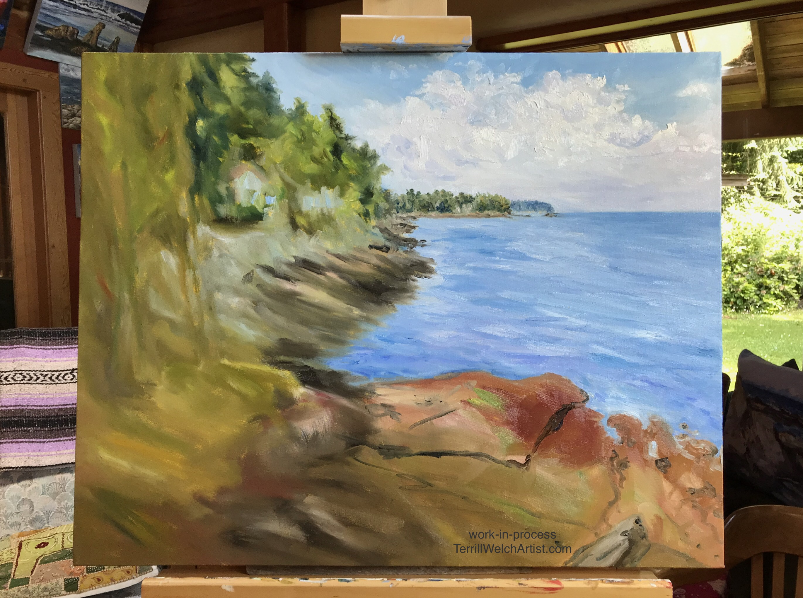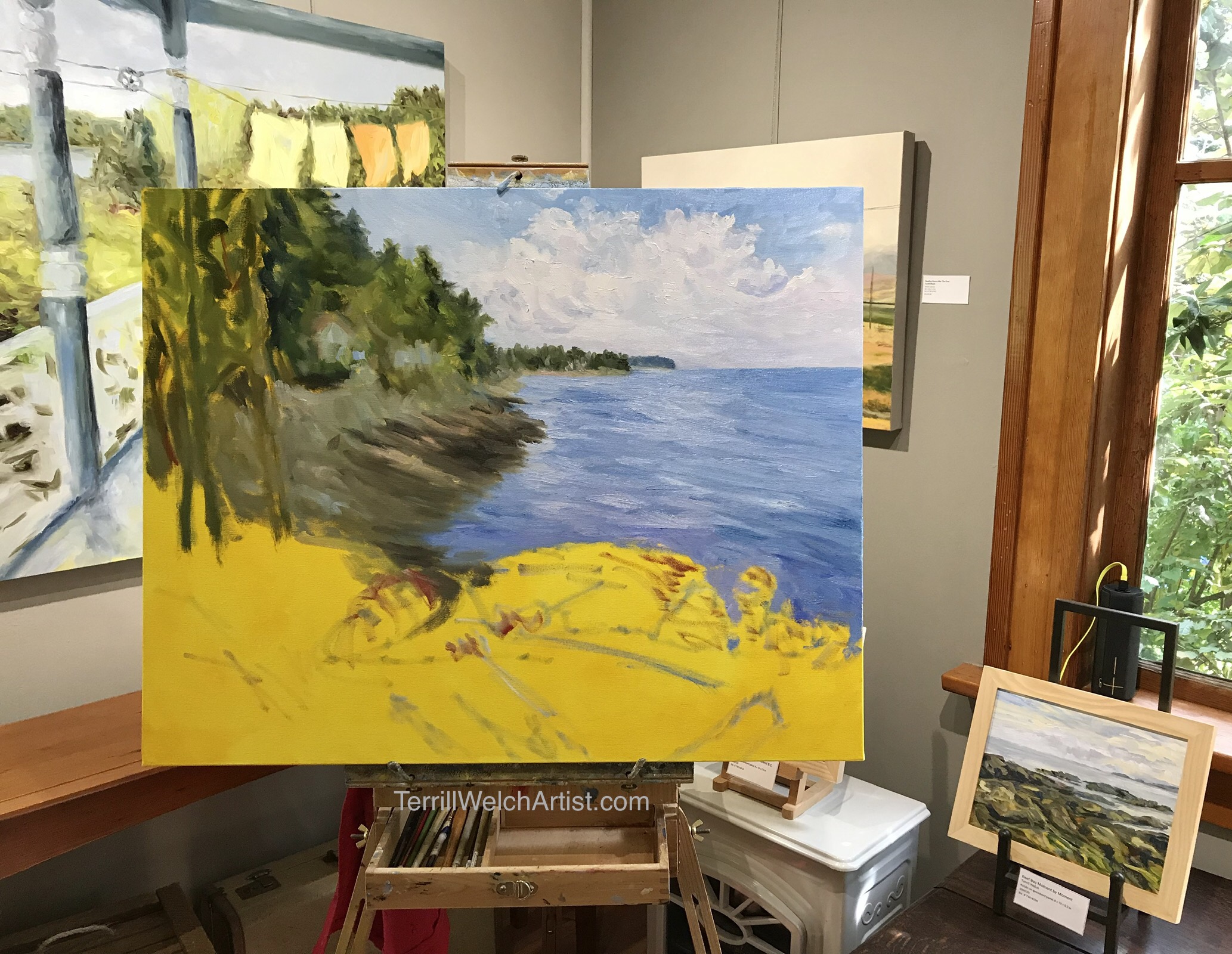 The first painting is part of a Red Line Series I am working on to depict the challenges of climate change on our treasured landscapes. If we look at the painting by itself, it is easier to discover.