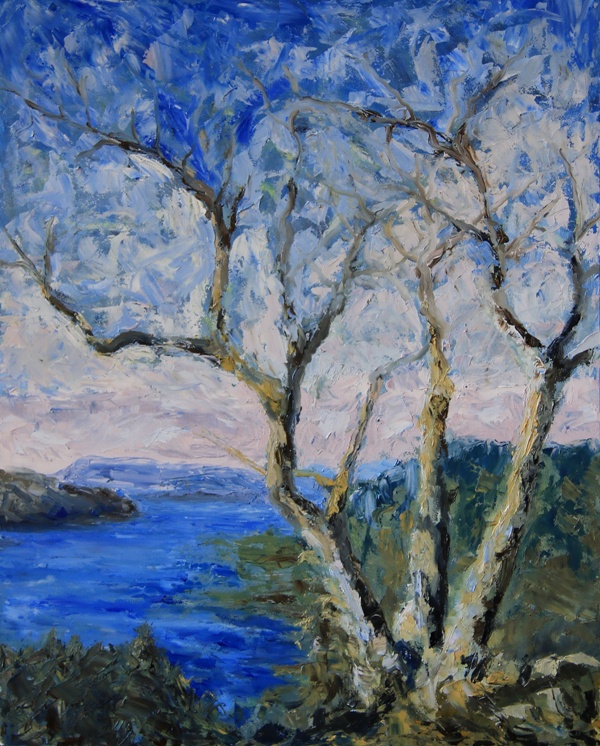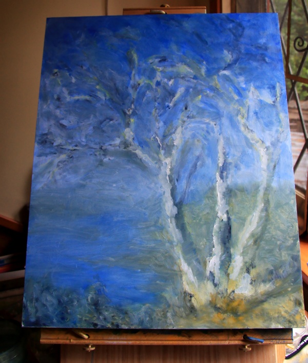 I have been working most of the day on the large canvas from the week before and the melancholy sea painting is my unwinding work after being corkscrewed up in the branches of that old arbutus tree.