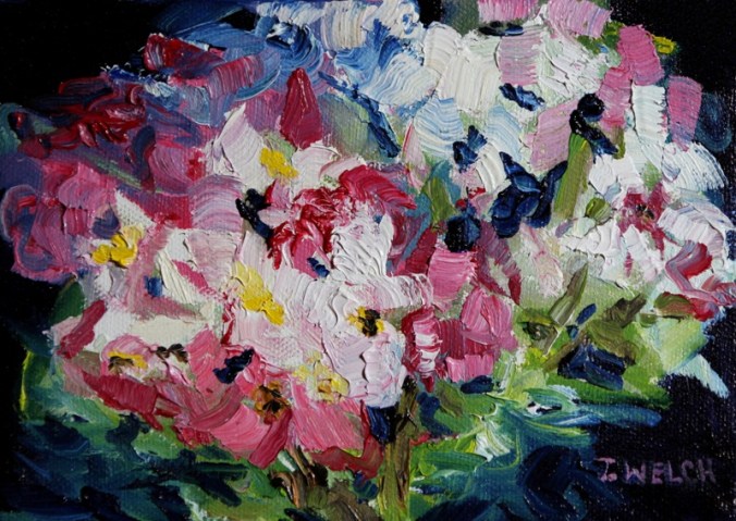 “In the Pinks Flowers” 5 x 7 inch oil on canvas with optional wood floating frame.