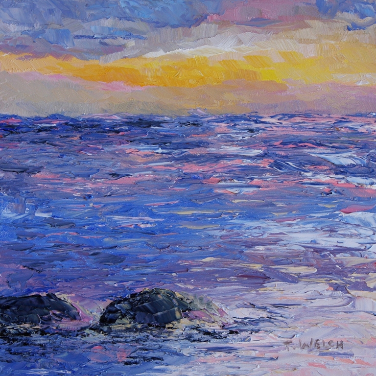 “Rocks at Sunrise” 8 x 8 inch oil on gessobord with 2 inch deep wood cradle.