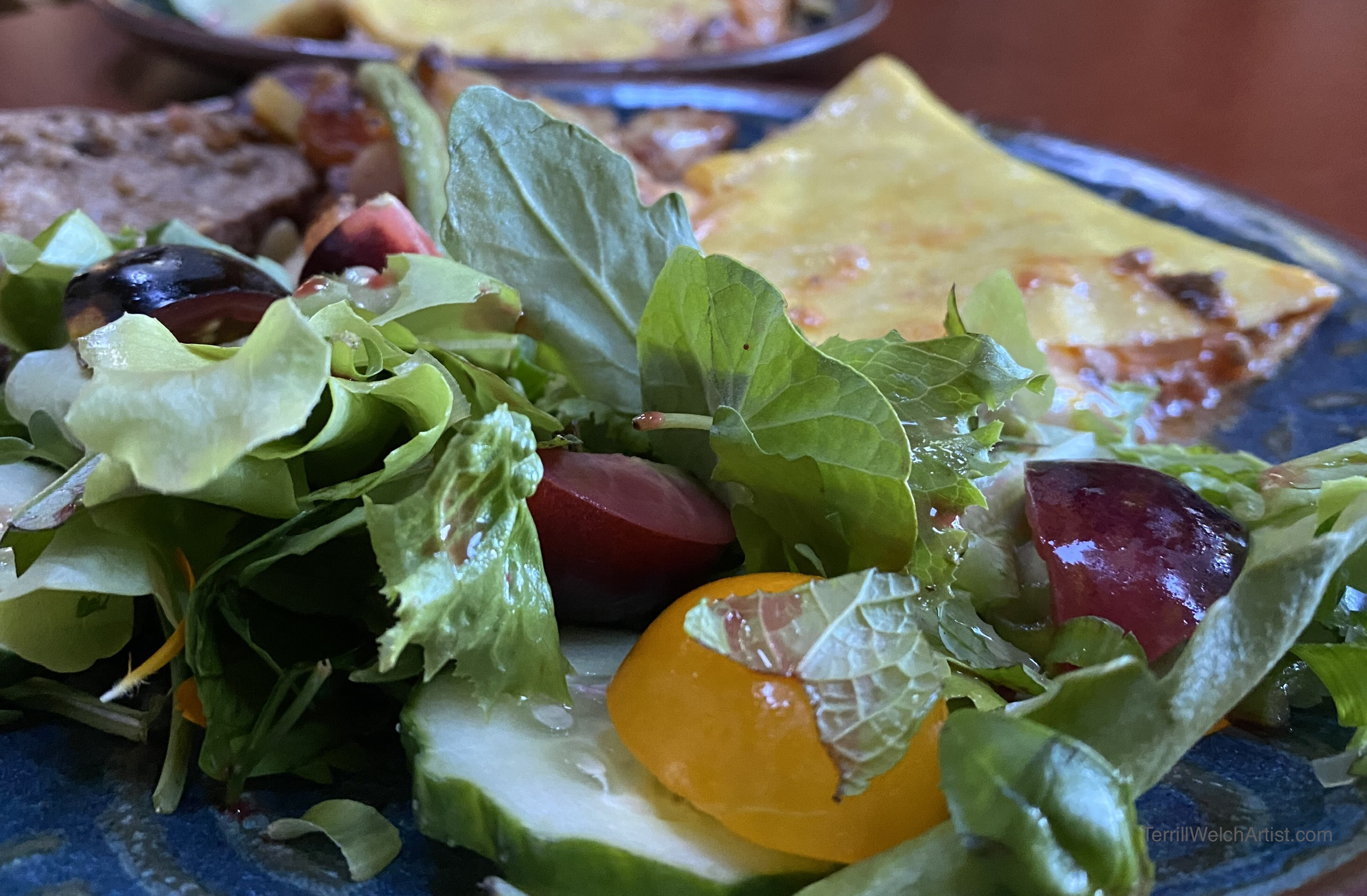 Spanish omelettes with tomato sauce and cheese with local salad greens for supper thanks to Raven Vale Farm.