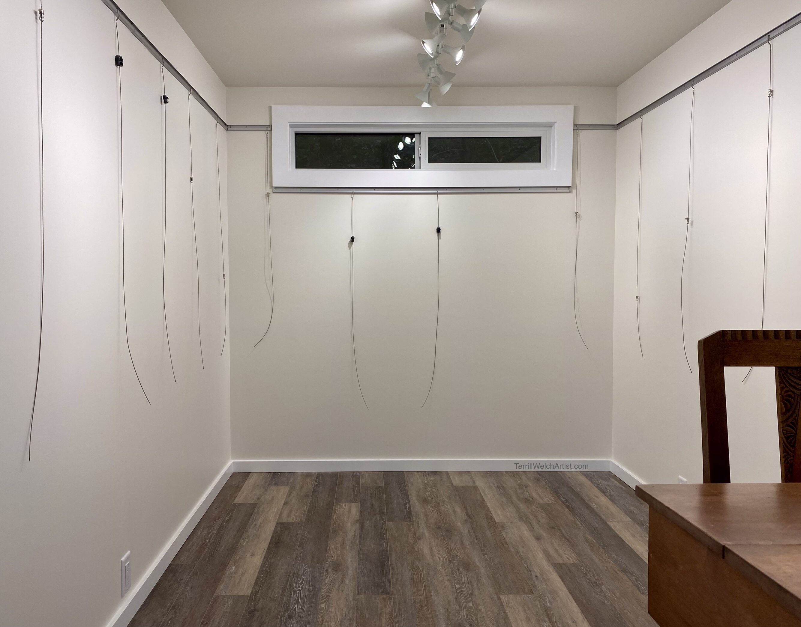 You would think it would get easier since we have done this twice before but there is still a lot of fiddling finding studs, cutting things to length and running to the hardware store a couple of times to get things we needed. Still, we got it done in a few hours and the next morning I twisted in all the lights into place and put the hanging wires up to get ready for paintings.