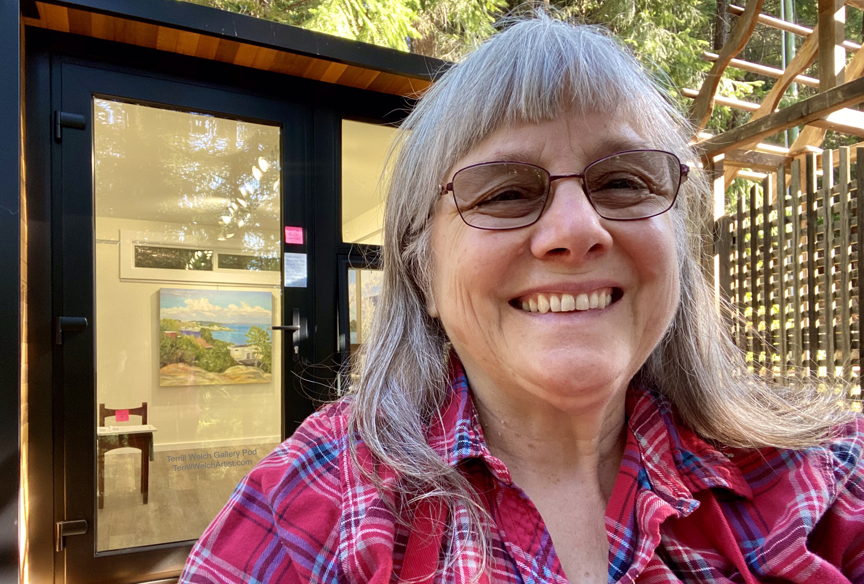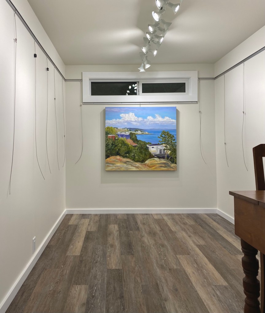 From there, the hanging went fairly quickly and now the paintings are all in place, including the guest painting by Jody Waldie. Every few weeks, there will be one larger guest painting by one of the local Mayne Island artists who show in the other Terrill Welch Gallery adventure – ISLAND TIME ART. This gallery space shows their smaller work in the blue building with Dragonfly at the ferry but it is just not quite large enough to put in many bigger work. The gallery pod can handle them though!