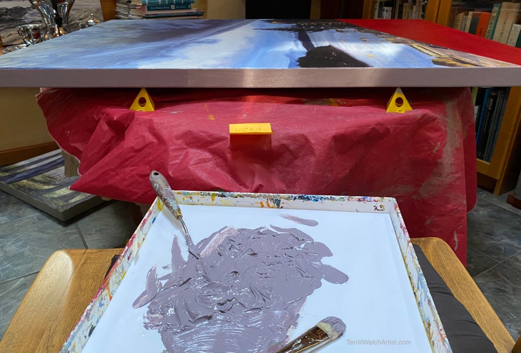 The second leaf was still in the kitchen table from a family visit on Sunday. Great! This will work perfectly to prepare a show frame or two and get new work into the inventory while also preparing an online private viewing room by special request for consideration of a specific landscape in a particular size range. Done! Plus, the work is also now set up the gallery pod for physical viewing over the next couple of days.