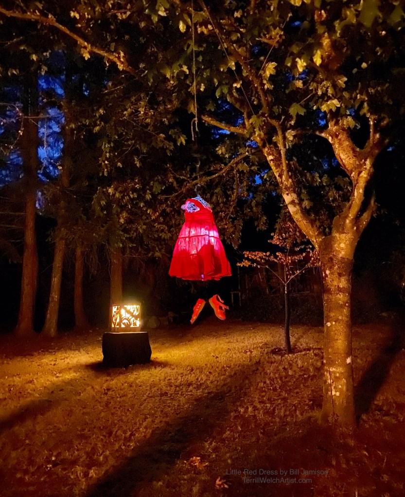 These are my reflections and thoughts after our visit to the last evening’s art installation and my all-to-brief conversations with Johnny Aitken who I consider a friend as well as an amazing artist and outstanding host of difficult and necessary conversations. I am not going to give you too much background on these various works by these three artists because they are design and intended to be interactive in their interpretation. I encourage you to go and see for yourself this evening or next from 7:30 – 9:00 pm on Sunday October 2nd or Monday October 3rd, 2022 at 450 Mill Rd, Mayne Island, B.C. After all, a conversation cannot happen if you do not show up to have one.