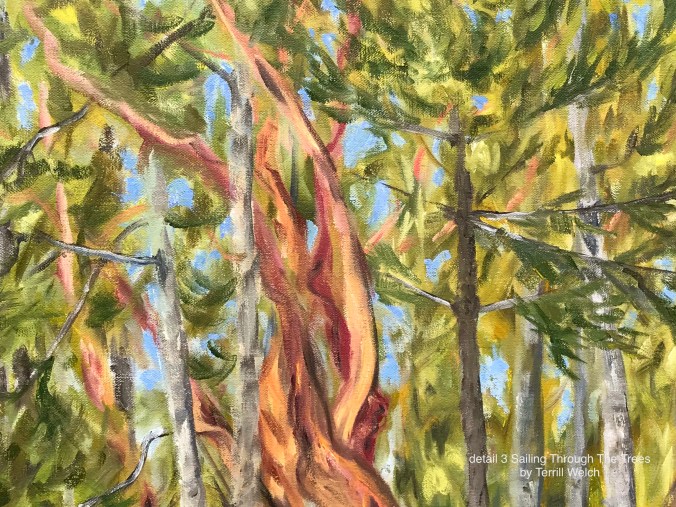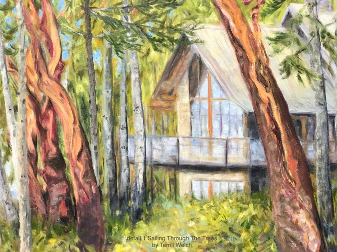 So close! Almost! Or maybe even done! Yes, you guessed right. The latest 30 x 40 inch canvas of Sailing Through The Trees is “resting”. But, before we go to the end, maybe you would like to see a short video of part of the process along the way? Yes? I thought so.
