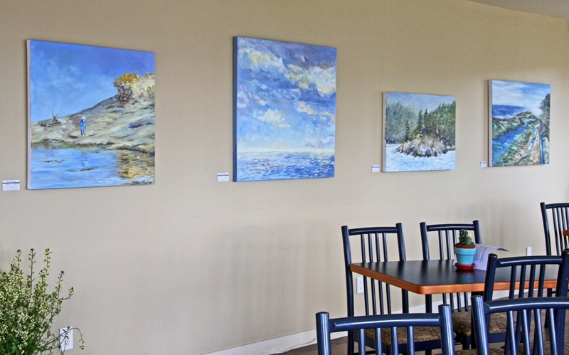 The latest request came from Colleen Wadsworth, the owner of the Bennett Bay Bistro at the Mayne Resort. When she asked if I would be willing to hang some of my paintings on her huge wall in the Bistro I had to swallow hard not to drool before I said a simple “of course, what did you have in mind?” Colleen took this photograph just after we got the four largest paintings up.