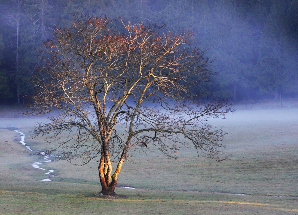 With the sun trapped behind a tree, I squint through the branches at the sea.