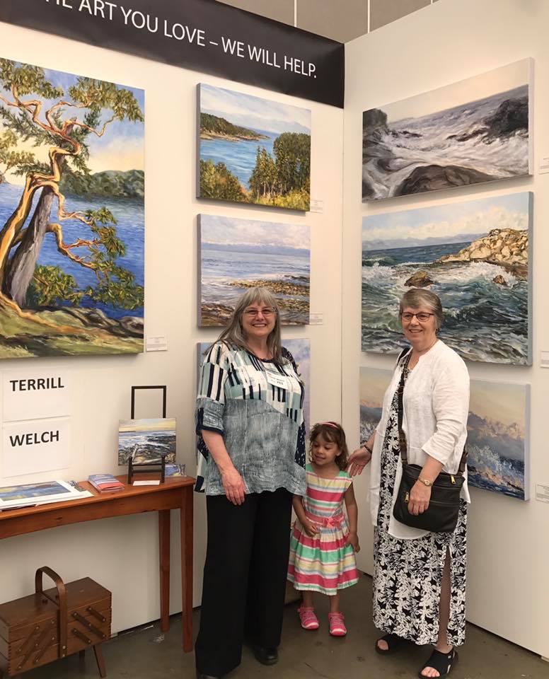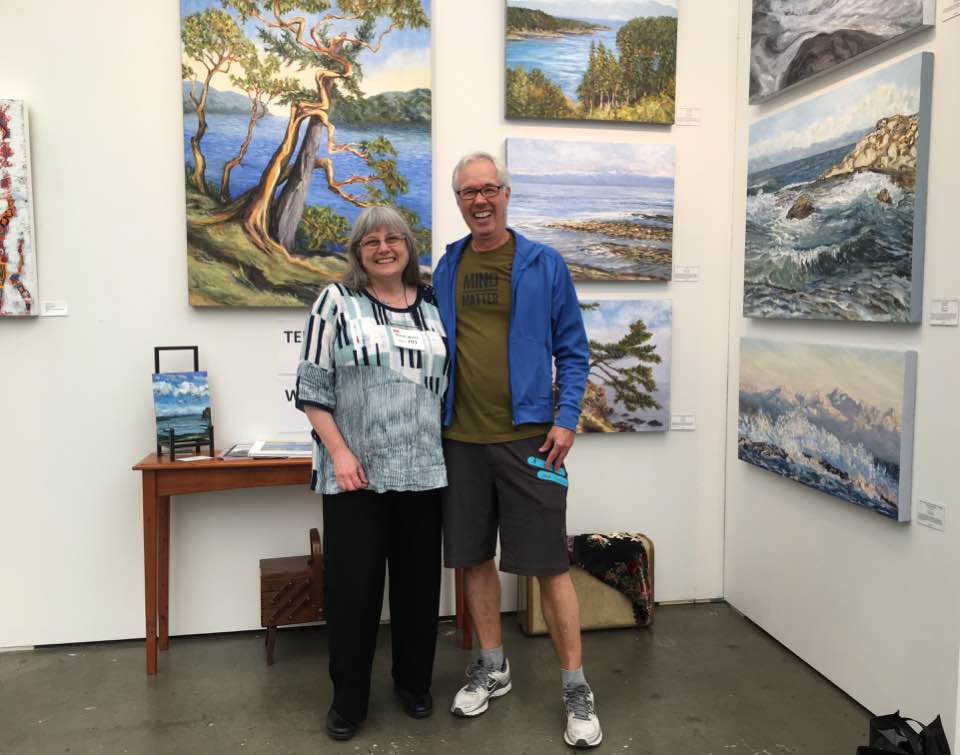 Often viewers would come close and then back up. Then come close again. Then they would walk slowly sideways and then back to the centre. Sometimes they would tell me that the waves were three dimensional and seemed to lift right out of the canvas. Other times it would be the tangle of the friendly arbutus tree that would hold their attention until a quick smile would appear just before they turned to talk to me. People were inspired by the movement, the brushstrokes, the colours and just the beauty of our west coast captured on the canvases. One of many precious moments was when we were all packed up with the paintings wrapped and ready to move a forklift driver in the complex stopped his machine to make a point of telling me how much he loved seeing my landscape paintings in the show.