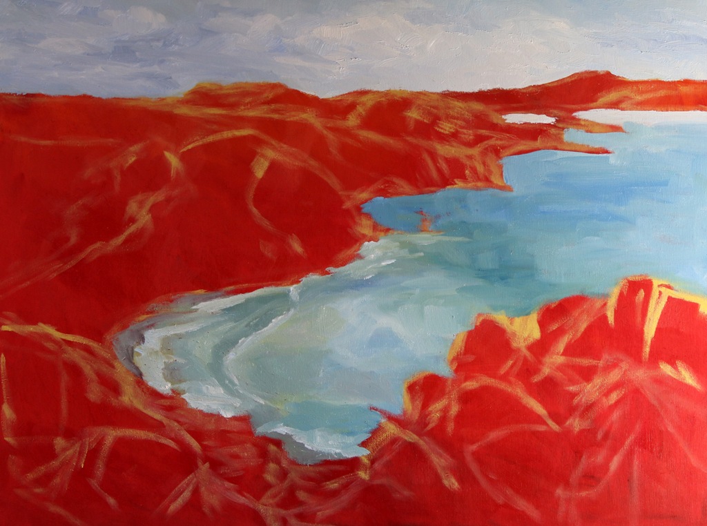 I was nervous about my intuition for this painting. The landscape is hardly known to me. Though I stood there for a long time trying soak in all the information I could. Though I had my photography sketch type images, I still wasn’t really sure if I understood or if I knew this place in my bones. I had not witnessed year after year of subtle seasonal changes. But also I question my ability because the California landscape does not have the cool clear blues of its northern sisters. The haze and atmosphere are warm and rich – almost buttery, even in early spring. There is a constant taste of chalk with a hint of salt on the air in this drought-ridden geography. I must learn a new palette, possibly even a new approach. I do not know this landscape even as my rain forest hair registers a more waif-like wisp on the sea breeze. I want to know it though. I listen and peer as if learning a foreign language. I am hypersensitive a I prepare to paint All my sensory recorders on high alert. What I can not discern, I must guess. I am doubtful of my ability to read the body language of this landscape with my brush where words and understanding fail me. But I must try. I painted the ground a week ago and this morning I start.
