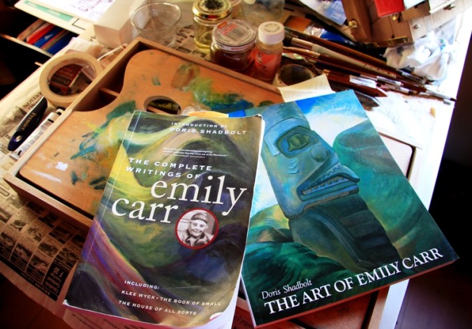 Through my life as an artist going right back to childhood, Carr has always been just out of sight, leaving me marks to follow as I forge my own artistic path. I feel Carr’s kindred spirit as I work – not in her brush stroke but in the strength and reverence for her west. I am not a scribe for what is before my eyes but rather that which is before my heart. My Emily understands this. I can tell you facts about her life – such as her breakdown while going to art school in Europe or the 15 fallow years when she lost her will and only painted seven works and stopped writing in her diary. I can tell you that her best work came after this time while she was in 50’s. I can tell you that she was loved but never married. I can tell you these things but it will be far more meaningful if you read her writings for yourself and if you browse the pages of Doris Shadbolt’s The Art of Emily Carr or if you go to The Greater Victoria Art Gallery and stand in front of her paintings and see the trees swaying as they reach skyward or if you watch Winds of Heaven by Michael Gostroff – a documentary that adds value and depth to all other experiences of a Canadian artist, a great artist, a woman artist, Emily Carr. May you also know the life and art of the Emily who sits beside me as I work.