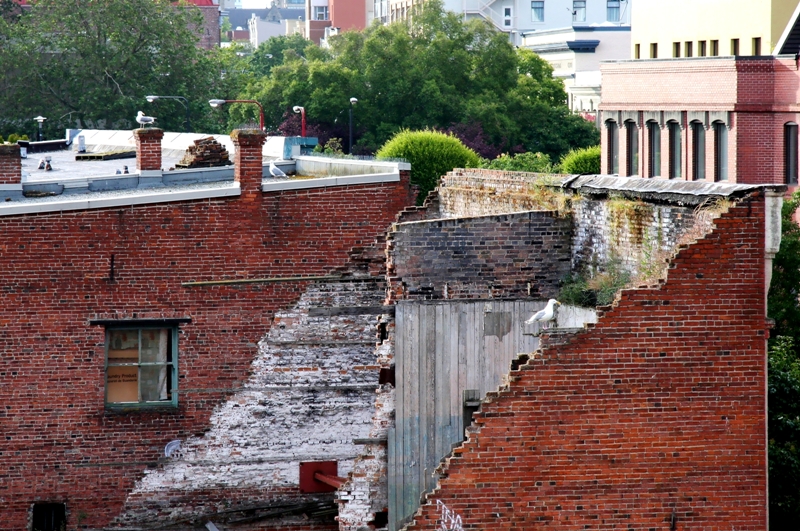 I have taken photographs of this remaining heritage wall from many angles. The wall was supposed to be integrated into a new development that went sour a few years ago and now the vacant lot is growing weeds and the wall is crumbling.