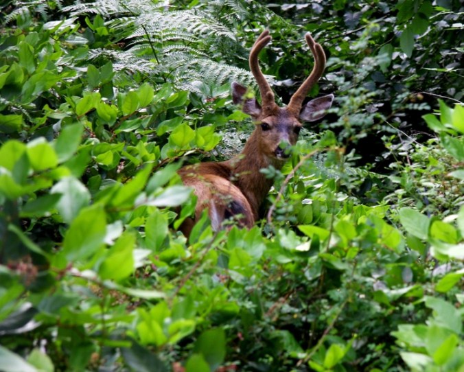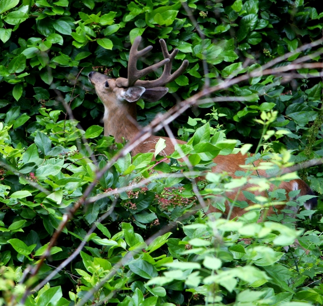 There is a herd of seven buck deer just on the other side of the deer fence browsing in the tall salal underbrush. I managed to get four decent images of these fellows well embedded in their natural environment. I have to whistle to get them to look at the camera.