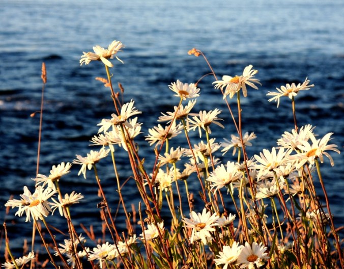 An image of last nights daisies by the sea are caught between the sounds.