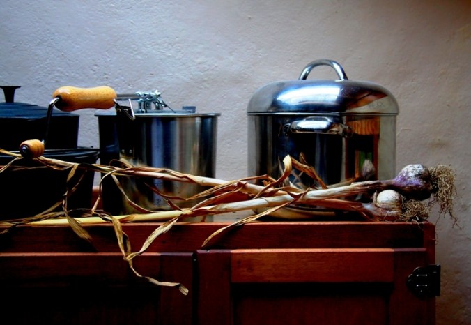 I am greeted by the garlic drying on the hoosier cabinet in the entry way, as I slipped out to get lemon balm and mint for my tea.