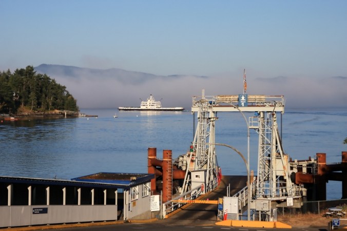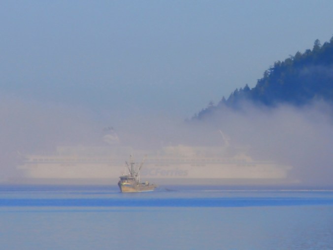 The Mayne Queen departs after dropping off passengers and vehicles from Saturna Island who join us in the wait for the Queen of Nanaimo. Blasts from the ship’s whistle can be heard as she navigates through the thick mist