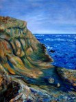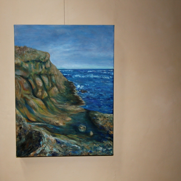 As a painter, I must “hold space” for a work from the first moments of standing before my subject, gathering information and feeling my way into the painting, right up until the final brushstroke that says – done! It is not a linear process but rather a series of sparse markers that move in and out of my awareness. The large “Sea and Shore” landscape oil painting is a good example of this.