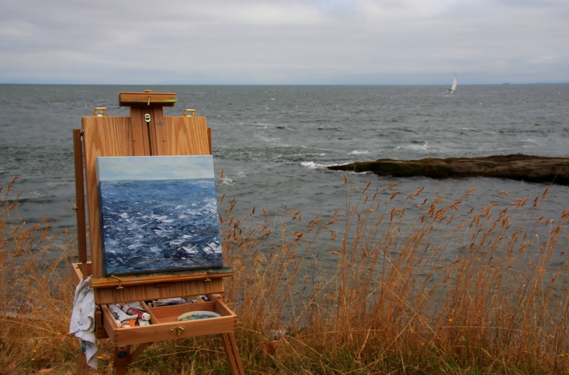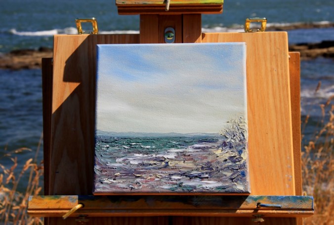 At this point, the process of painting is kind of like driving a race car for me. You know how you don’t usually need to think about driving to the corner store unless there is something really unusual, like a fallen tree on the road or you have sprained your wrist and you must be careful when you are shifting gears? When we have been driving for years, we can usually just navigate to where we want to go and not think too much about steering, breaking, obeying the speed limit or putting on our turn signal and such. We have become accustom to monitoring all the various aspects of being able to drive successfully from one place to another. Well, painting wet-into-wet is a little like developing the skills of an endurance race car driver. One must plan ahead, be quick, precise, accurate and have extensive training while practicing regularly… and the painting still might crash and burn! The painter must be courageous, step into the risk of failure, and use her split-second decision-making skills to save the painting and possibly even herself. And when it works, then it is magic! Then you can hear the waves, smell the sea or feel the breeze coming across the landscape.