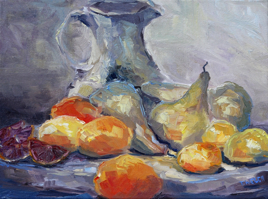 WINE VASE, PEARS, LEMONS AND BLOOD ORANGES 12 x 16 inch oil on canvas