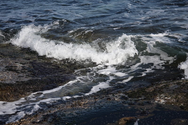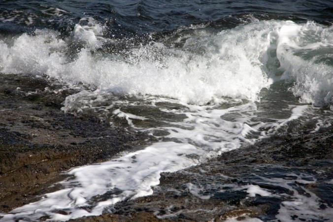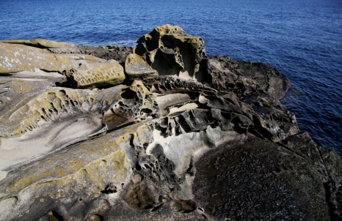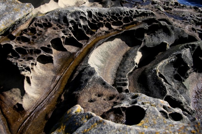 I paint the sandstone cliffs with their heavy underbelly colours. The sea rushes towards my brush – pushing and pulling. I witness the internal tension.