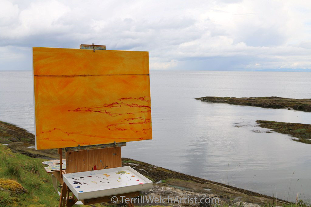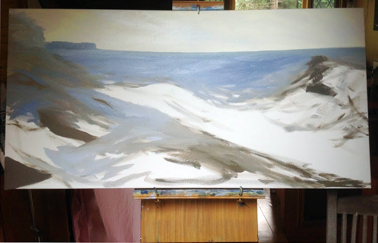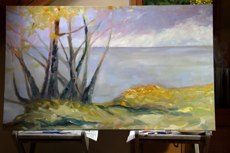 First, I started working a new 20 x 36 inch oil on canvas of arbutus trees this week. The canvas is just blocked in but I think it is possible to see where it going. It will be another in my Red Line Series. I anticipate this series being the second show in the gallery pod but it might be the third. We shall see.