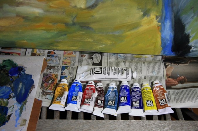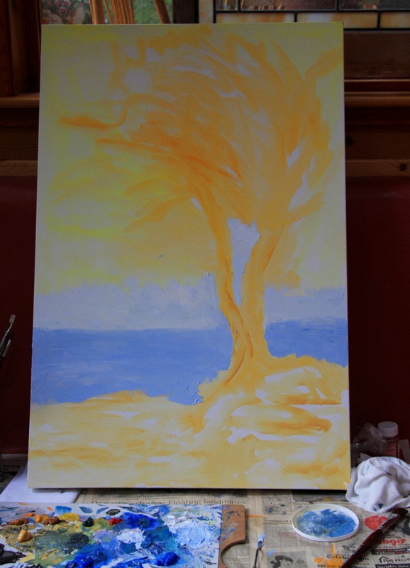 The large upright canvas did not fit on my easel so I painted down in the sun room which is a deliciously bright place to work.