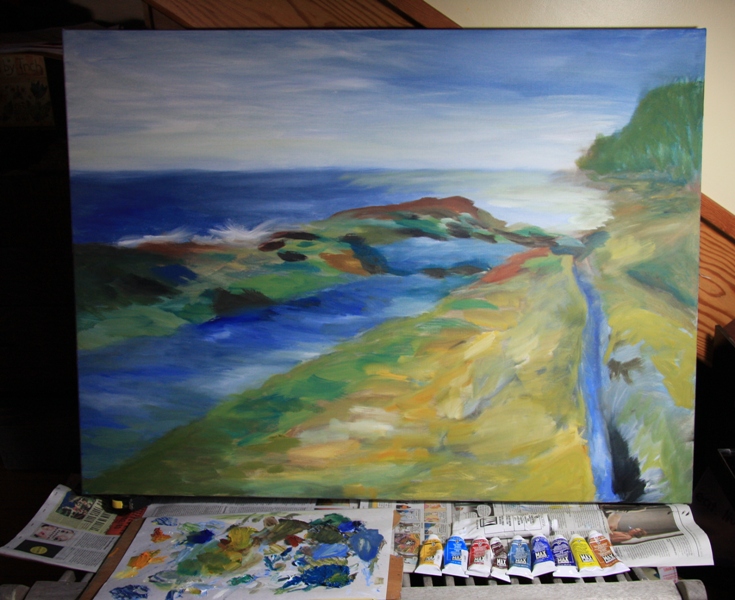Days pass and I walk by the painting pondering and anticipating my next chance to settle in for a good long stretch working my brush across its canvas. The time finally comes. I spend the day happily trying to “reach the sea.” But something is off. The painting is struggling and seems to be twisting on the canvas. What is it?