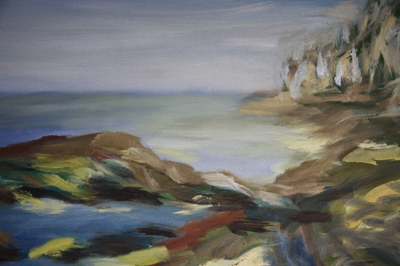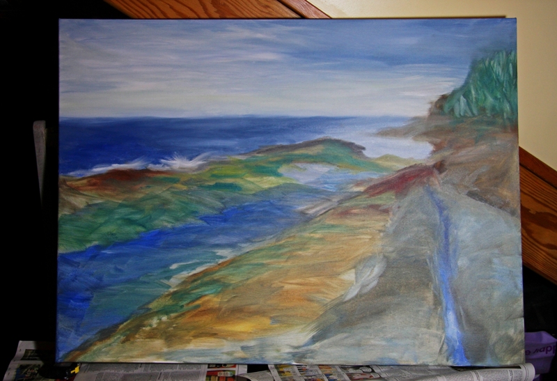 When I work a canvas up with this kind of underpainting, I begin to physically learn the window of space and the painting language that will be translated onto the canvas from my sensory information which I have gathered up to this point. My physical reference material will often include both photography and painting sketches.The sensory information is much more than what I see. It includes what I heard, smelled, tasted, and felt. There was the rolling of the stones on the shore beside me and the steps of people walking past. I could feel wind pushing cold air into my back and brushing my hair across my face. I could smell the cold dampness of snow, rain and salt. My eyelashes were cool. My hands were stiff with cold. But there was a warmth in the gray, the blue-green and the a brightness in the sky that was punctuated by the sturdy cliffs and the jut of land. It is all of this that I must translate into brushstrokes. The movement of the brushstrokes for the underpainting are like rough notes for the beginning of this painting conversation. I am intimately aware of the forcefulness between the elements of this seascape. I want this on the canvas from the very beginning.