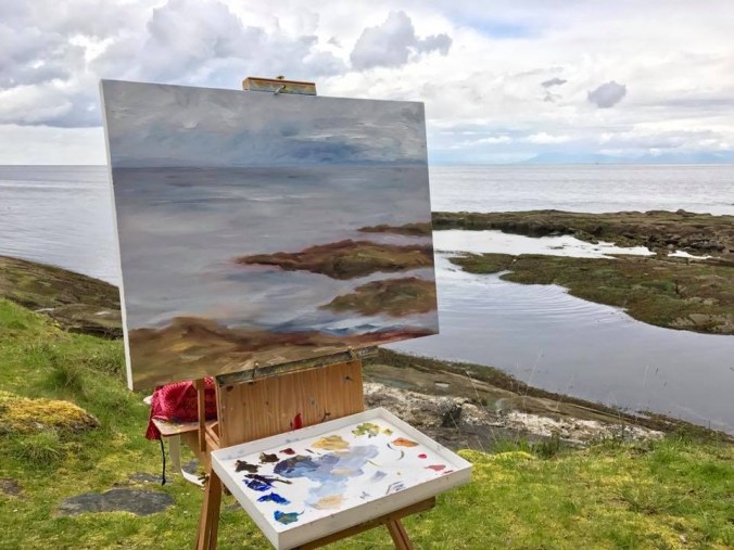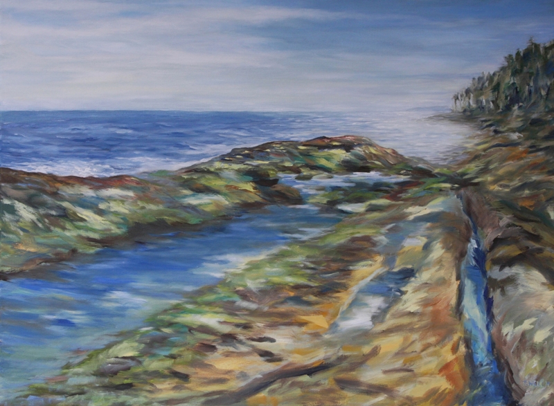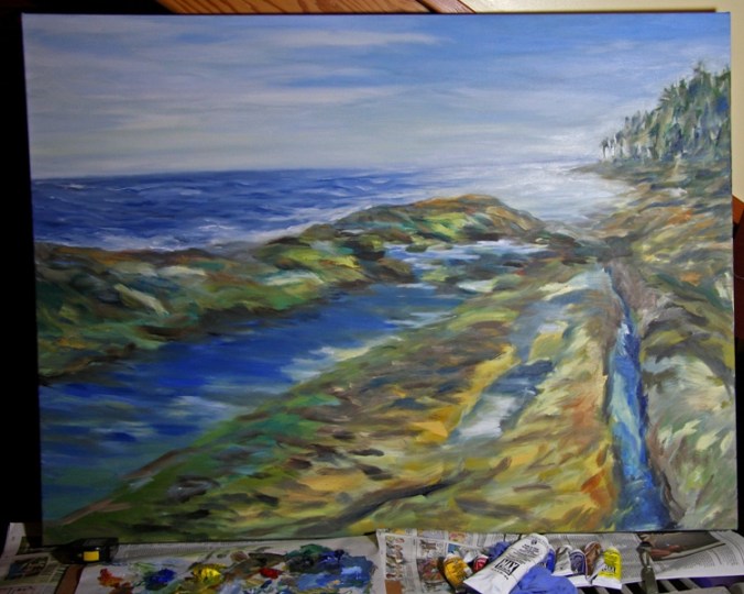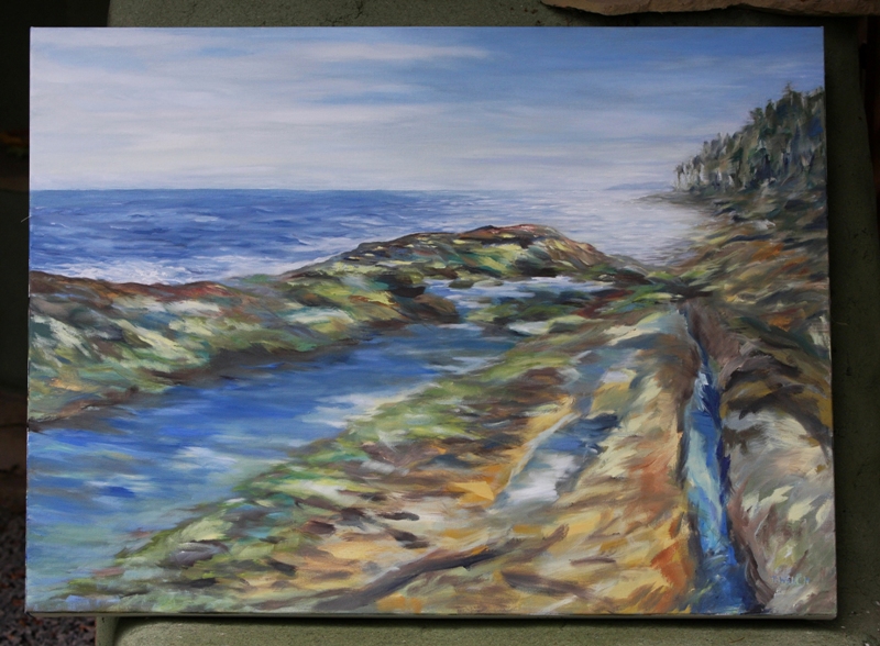 The painting has never really tightened up and the layers have built themselves in the generous way of land and sea in perpetual transformation. I have heard many times that green is one of the most difficult colours to mix. The green of seaweed. The brown of sandstone. The diverse blues of the sea. The brightness of the facing the midday sun. The deep shadows of the shoreline. Thank heavens for the light, softness of the sky! … I see a few wayward brushstrokes, maybe a little lighter over here and yes, a little darker over there. Done!