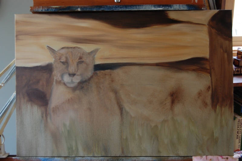 It is the biggest oil on canvas I have done so far. It taught me to painting standing up so I had a better range of motion. But the truth of the matter is, I think, the name says it all. The cougar watched me through the whole painting. I would set her aside, sometimes for long periods of time, as other aspects in life needed to be attended to or I puzzled over achieving the effect I wanted, but she was always watching and waiting. Sometimes, even demanding, that I take the time to finish. She is finished, and yet, she watches.