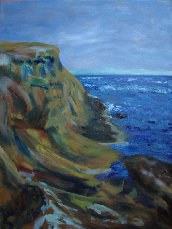 I paint the sandstone cliffs with their heavy underbelly colours. The sea rushes towards my brush – pushing and pulling. I witness the internal tension.
