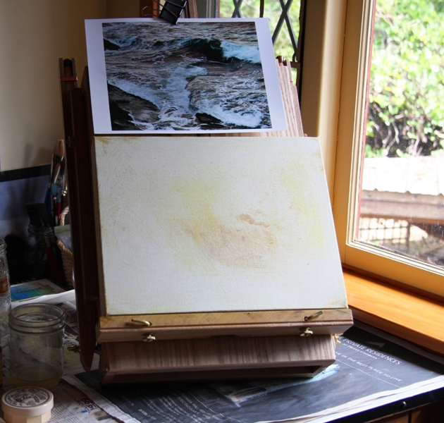 I knew I needed the cadmium underpainting to hold the seascape together – I did not know it would also hold me together as I painted.