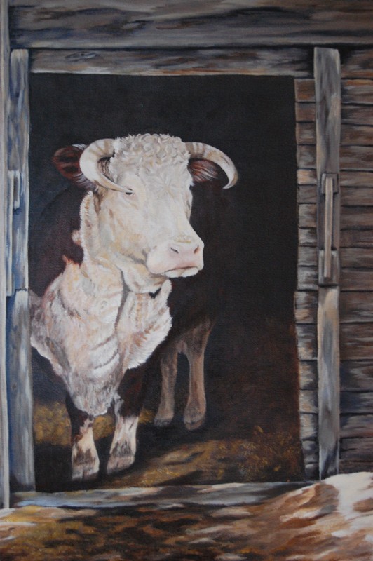 Bonus: Here is a photo of a finished oil painting “The Cow” by my sister Sue Wiebe whose work some of you had asked to see. Excellent control of shadow and light.